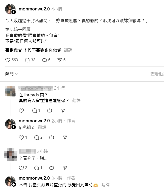 吳夢夢23日發文,提到有不少網友私訊提問:「妳喜歡無套?真的假的?那我可以跟妳無套嗎?」對此,吳夢夢在Threads統一回應:「我喜歡的是『跟喜歡的人無套』,不是『跟任何人都可以』。台南平價搬家」,並直球強調:「喜歡做愛,不代表喜歡跟你做愛」。